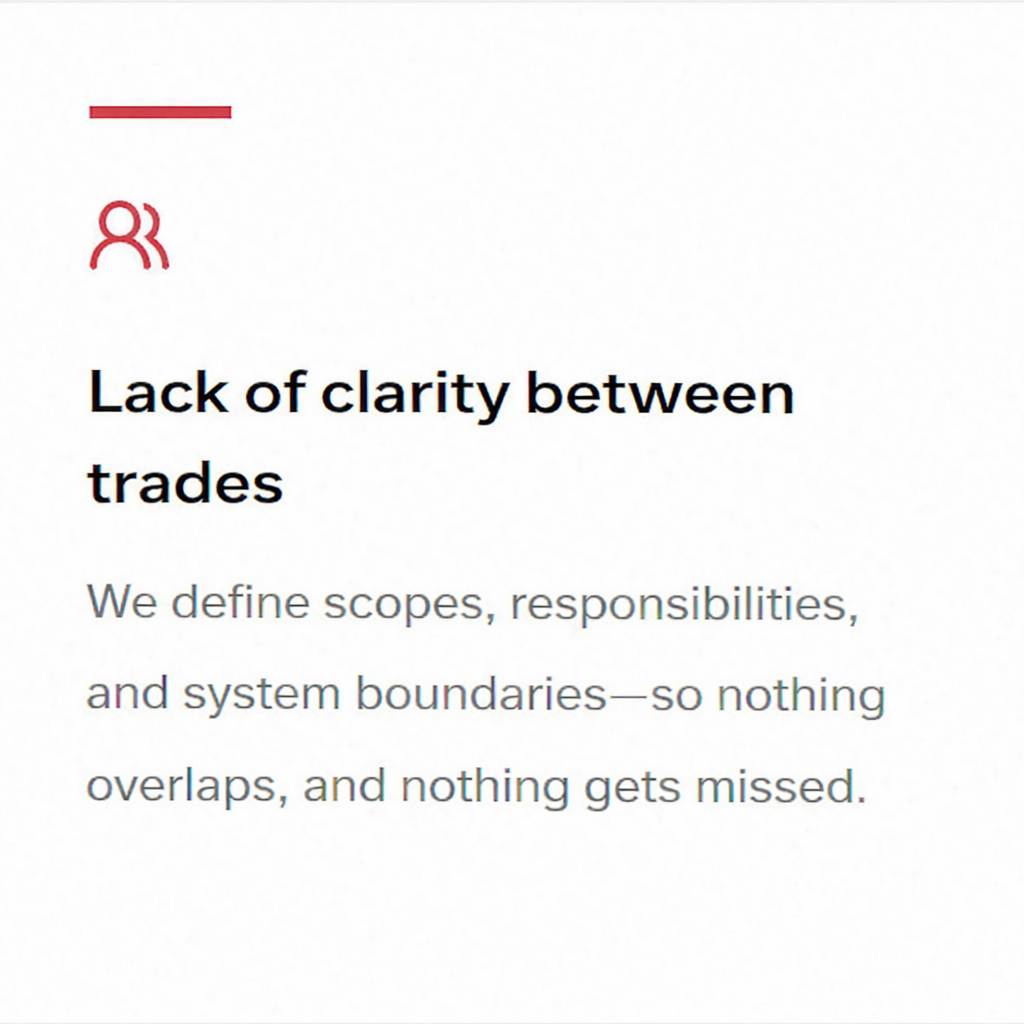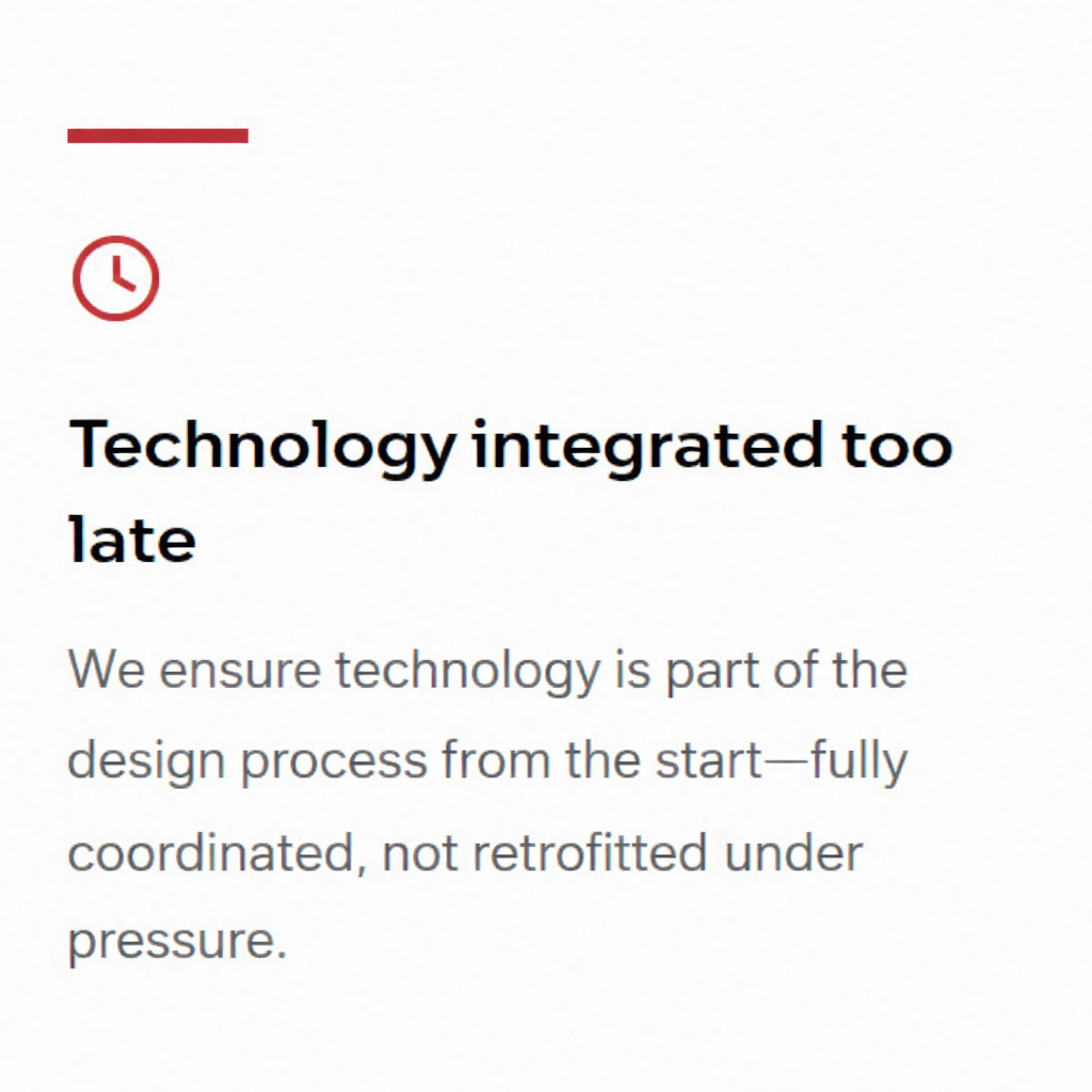 Technology is often treated as an afterthought. We help teams avoid late surprises by planning early and coordinating carefully.
